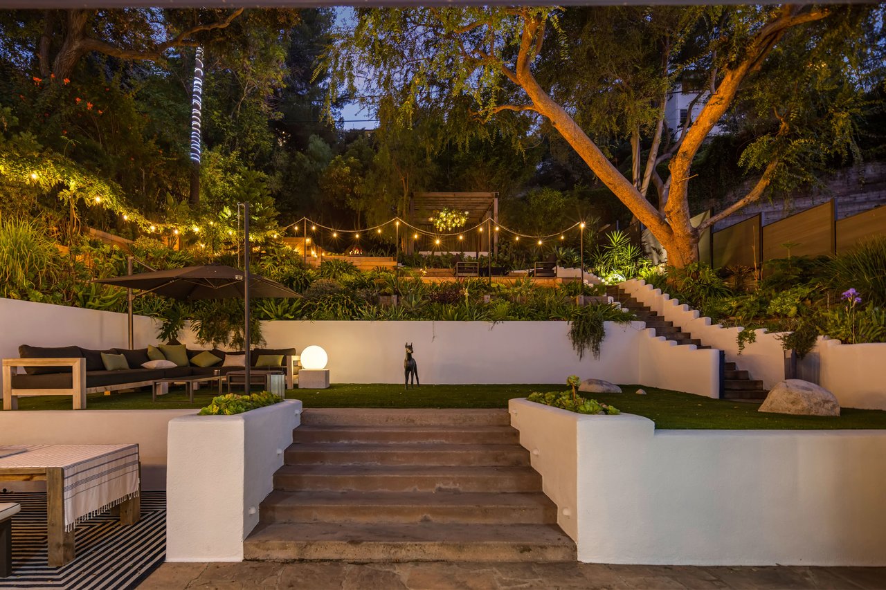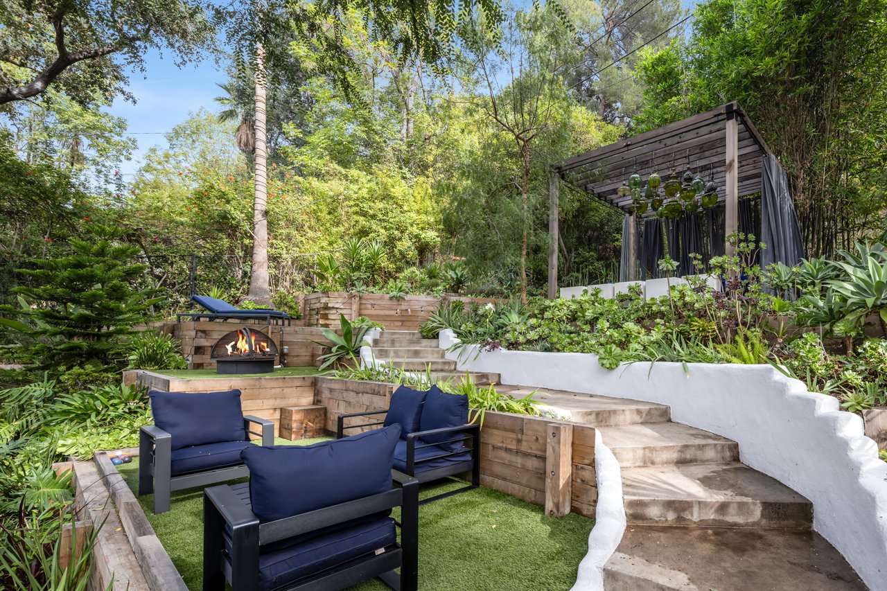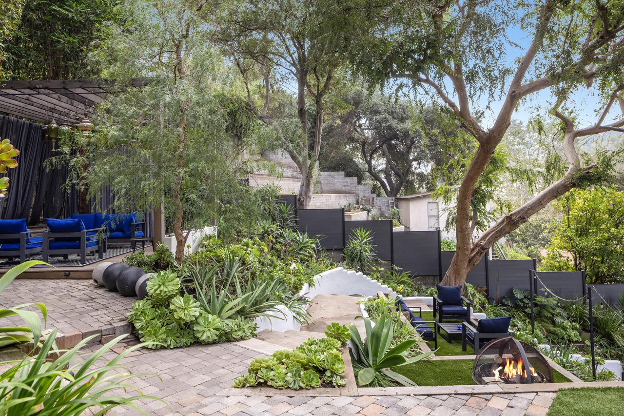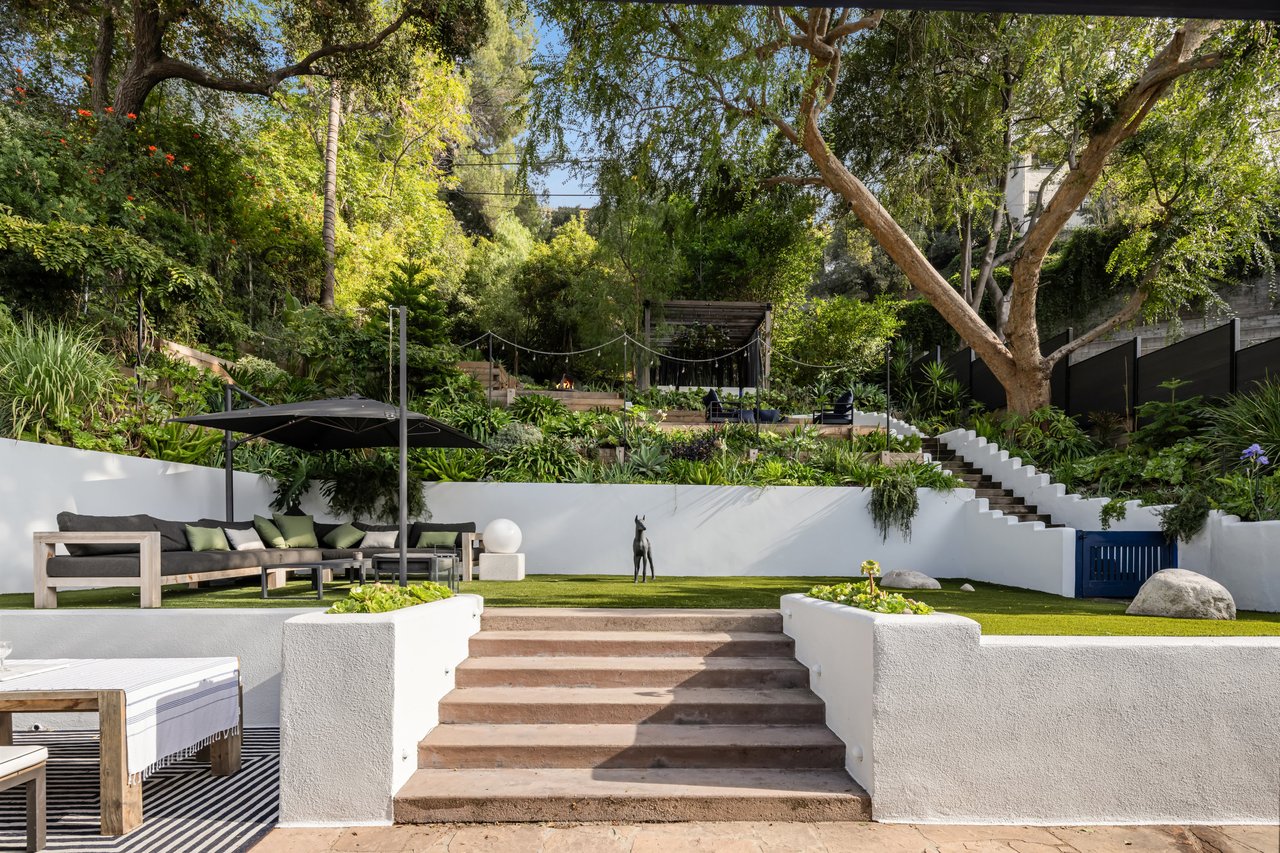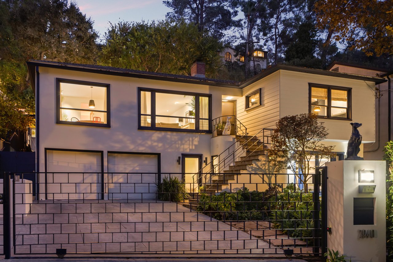 This gated Traditional home with mid-century modern influences sits on a large, wooded lot in upper Beachwood Canyon. Formerly celebrity-owned and tucked back from the street, this home's expansive rear yard is an outdoor sanctuary bringing the tranquility of nature to everyday living. Green canyon views can be seen from the oversized windows creating an airiness throughout the living space, anchored by a renovated kitchen which seamlessly joins both interior living and the outdoors. The kitchen is outfitted with built-in, luxury appliances, a large island, and plentiful countertop prep space. Whether you prefer entertaining or quiet fireside moments, this home offers the space for your household to sprawl on the 4 bedroom, 3 bath main level inclusive of an oversized, primary suite with custom Walnut built-in's and dedicated laundry/utility room. Rear French doors open to your own secluded park-like garden designed for entertaining. Winding paths of the curated grounds showcase its succulent gardens, professionally landscaped terraces, several lounging areas, banana and Meyer lemon trees, and private hilltop pergola illuminated by a masterfully designed light installation. Out of town guests can enjoy the privacy of a private guest suite on the lower level with its own kitchenette, bathroom, bedroom/office and private garden. The two-car garage features built-in cabinets & utility sink. Close to hiking trails, Beachwood market, city night life, and major studios. Experience the magic of this private sanctuary in iconic Beachwood Canyon.