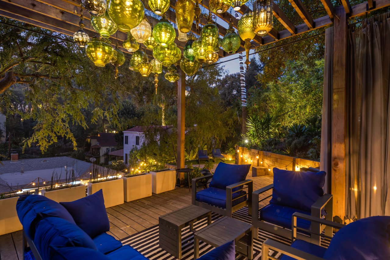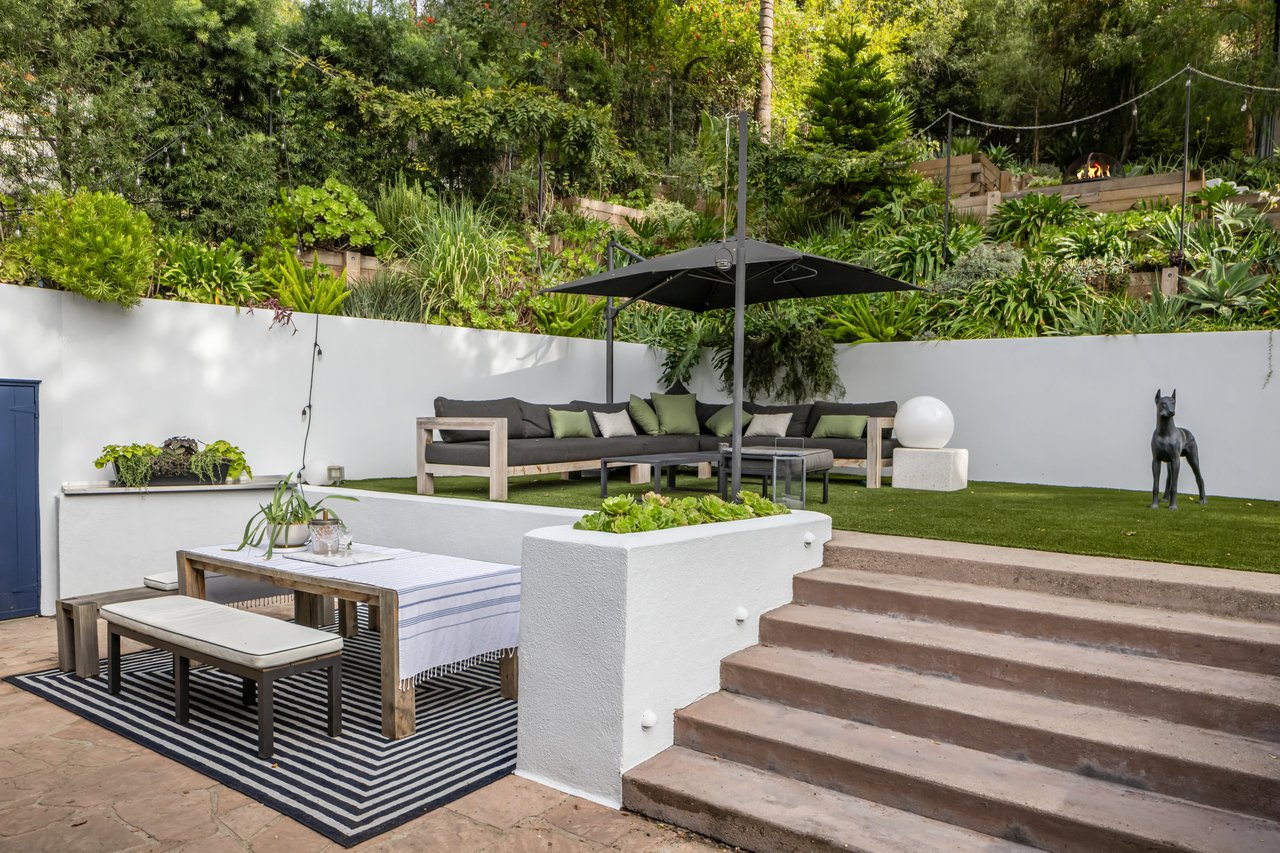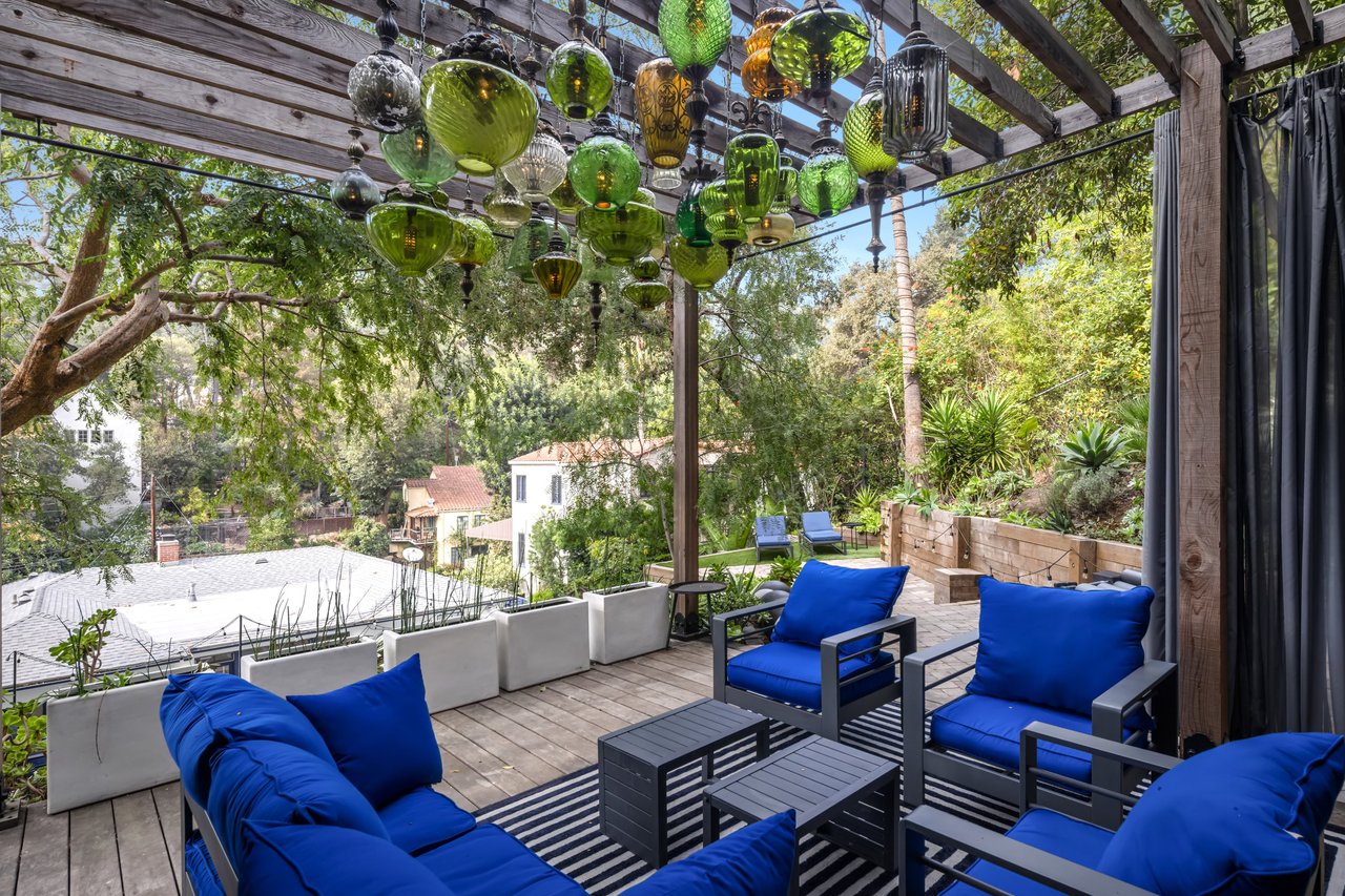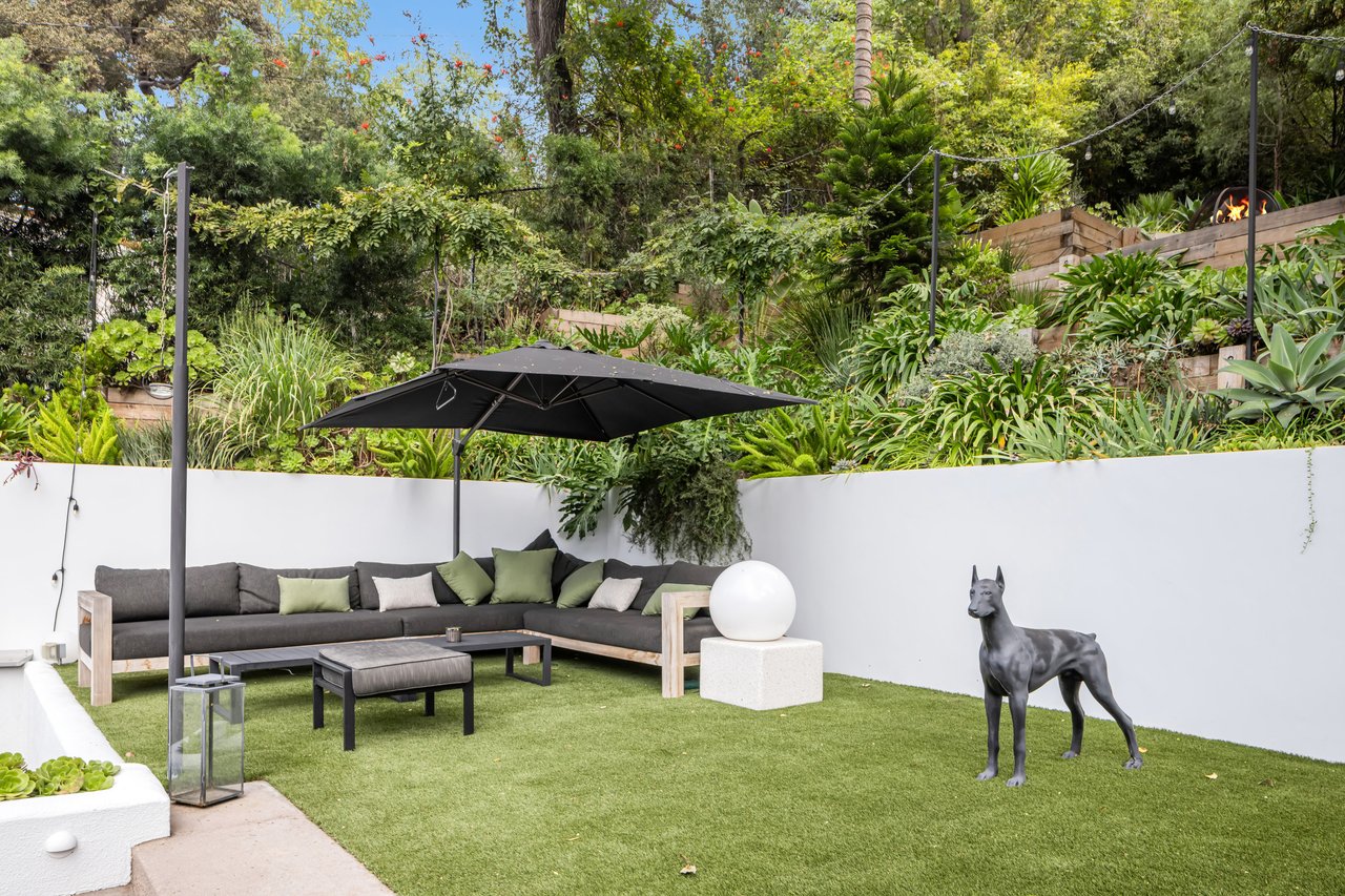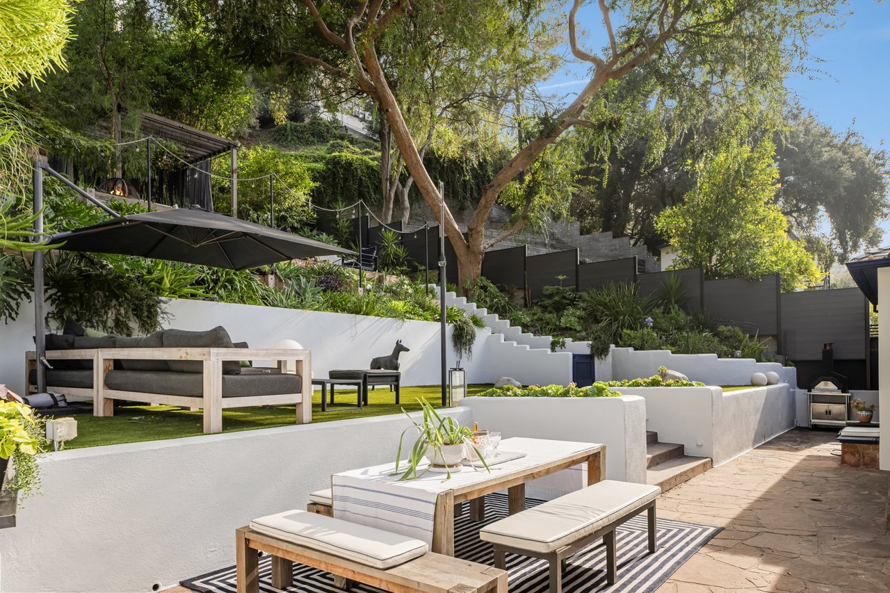 This gated Traditional home with mid-century modern influences sits on a large, wooded lot in upper Beachwood Canyon. Formerly celebrity-owned and tucked back from the street, this home's expansive rear yard is an outdoor sanctuary bringing the tranquility of nature to everyday living. Green canyon views can be seen from the oversized windows creating an airiness throughout the living space, anchored by a renovated kitchen which seamlessly joins both interior living and the outdoors. The kitchen is outfitted with built-in, luxury appliances, a large island, and plentiful countertop prep space. Whether you prefer entertaining or quiet fireside moments, this home offers the space for your household to sprawl on the 4 bedroom, 3 bath main level inclusive of an oversized, primary suite with custom Walnut built-in's and dedicated laundry/utility room. Rear French doors open to your own secluded park-like garden designed for entertaining. Winding paths of the curated grounds showcase its succulent gardens, professionally landscaped terraces, several lounging areas, banana and Meyer lemon trees, and private hilltop pergola illuminated by a masterfully designed light installation. Out of town guests can enjoy the privacy of a private guest suite on the lower level with its own kitchenette, bathroom, bedroom/office and private garden. The two-car garage features built-in cabinets & utility sink. Close to hiking trails, Beachwood market, city night life, and major studios. Experience the magic of this private sanctuary in iconic Beachwood Canyon.