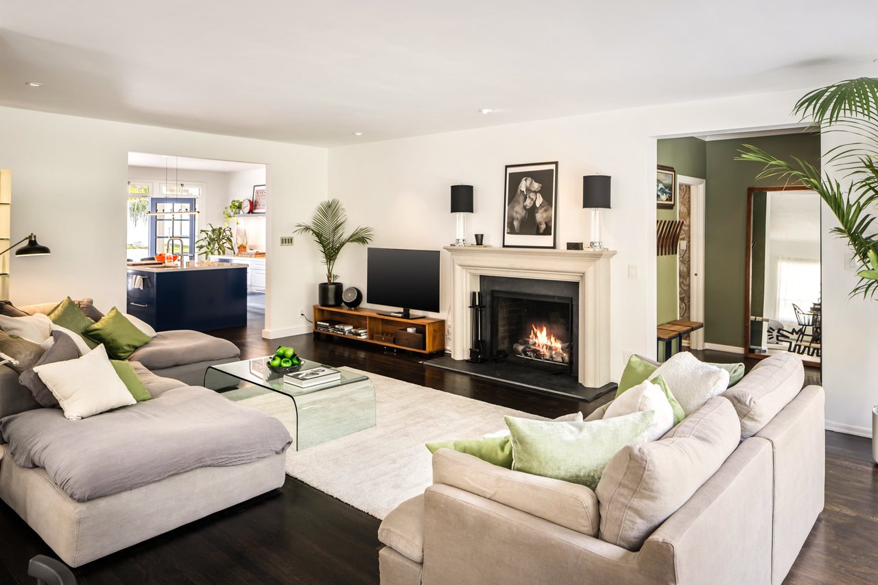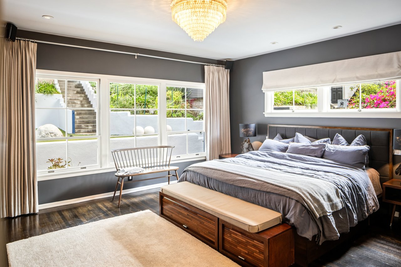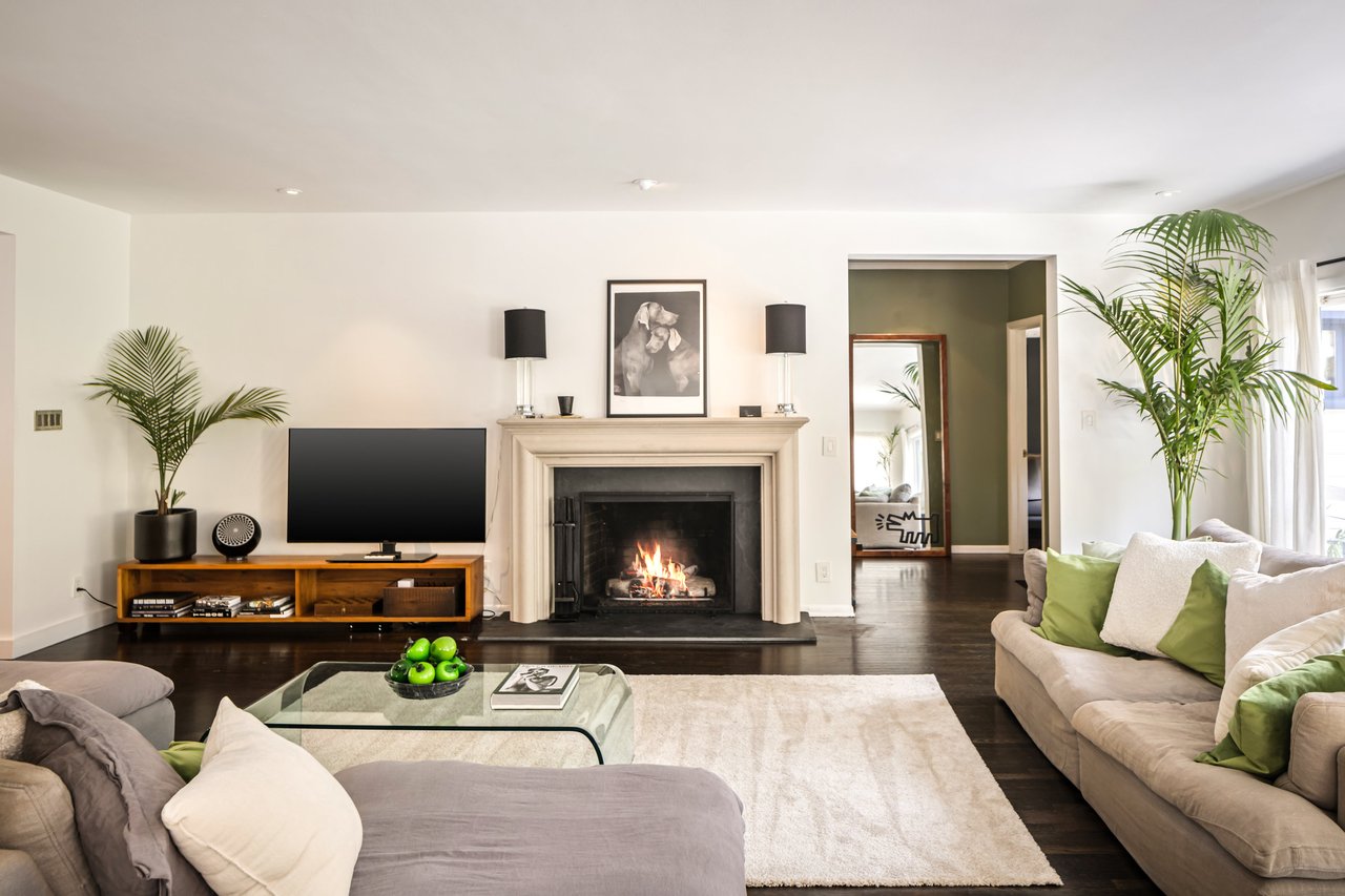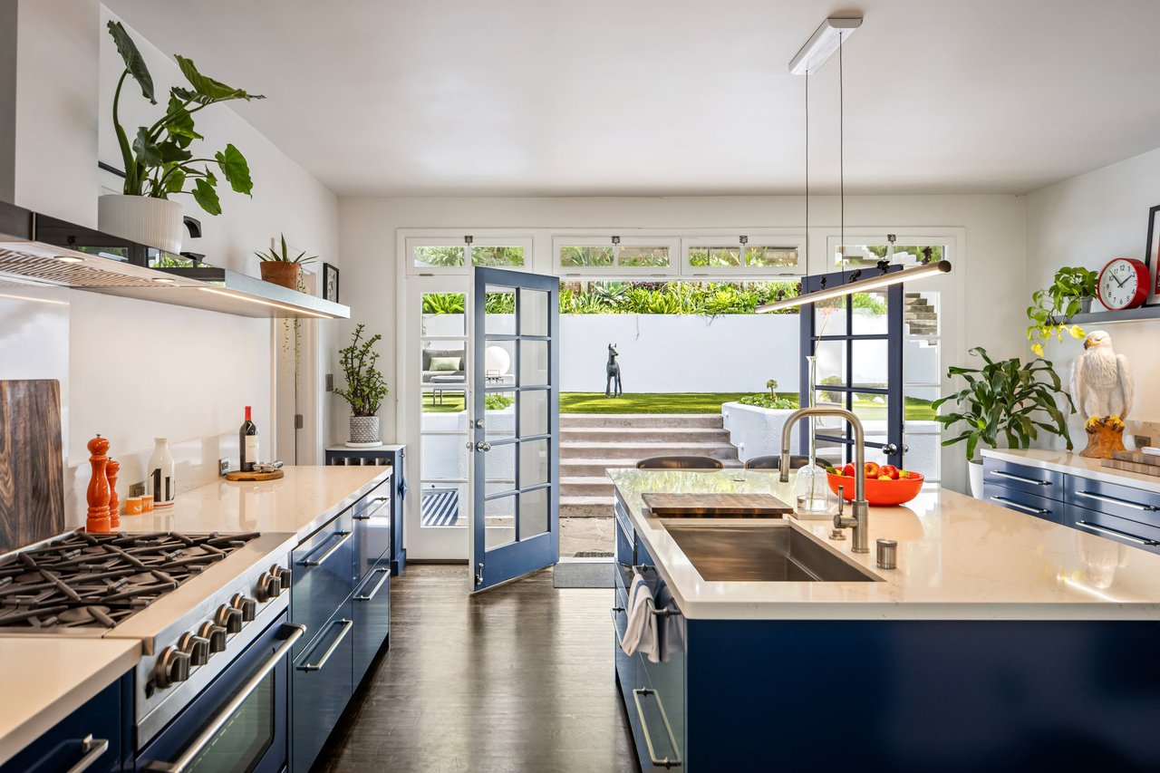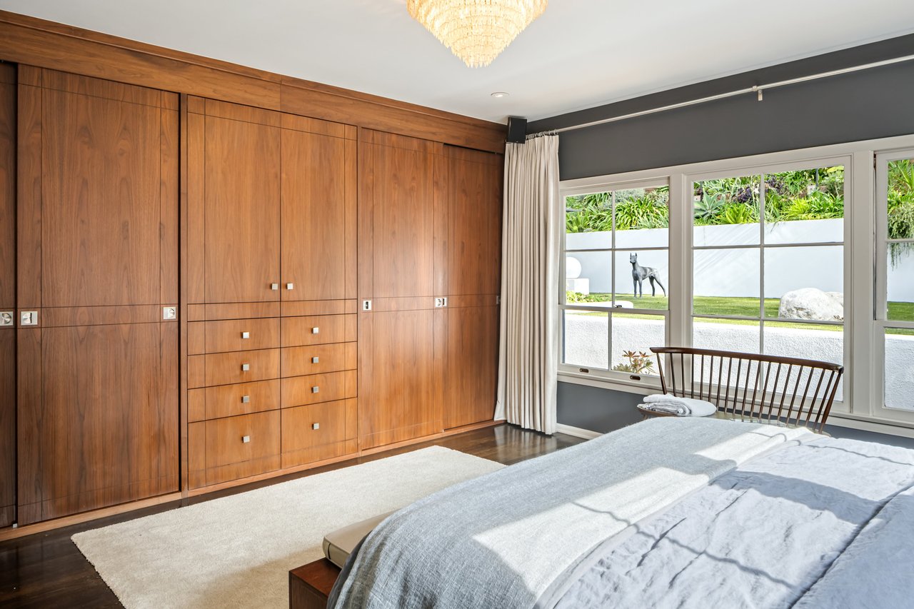 This gated Traditional home with mid-century modern influences sits on a large, wooded lot in upper Beachwood Canyon. Formerly celebrity-owned and tucked back from the street, this home's expansive rear yard is an outdoor sanctuary bringing the tranquility of nature to everyday living. Green canyon views can be seen from the oversized windows creating an airiness throughout the living space, anchored by a renovated kitchen which seamlessly joins both interior living and the outdoors. The kitchen is outfitted with built-in, luxury appliances, a large island, and plentiful countertop prep space. Whether you prefer entertaining or quiet fireside moments, this home offers the space for your household to sprawl on the 4 bedroom, 3 bath main level inclusive of an oversized, primary suite with custom Walnut built-in's and dedicated laundry/utility room. Rear French doors open to your own secluded park-like garden designed for entertaining. Winding paths of the curated grounds showcase its succulent gardens, professionally landscaped terraces, several lounging areas, banana and Meyer lemon trees, and private hilltop pergola illuminated by a masterfully designed light installation. Out of town guests can enjoy the privacy of a private guest suite on the lower level with its own kitchenette, bathroom, bedroom/office and private garden. The two-car garage features built-in cabinets & utility sink. Close to hiking trails, Beachwood market, city night life, and major studios. Experience the magic of this private sanctuary in iconic Beachwood Canyon.
