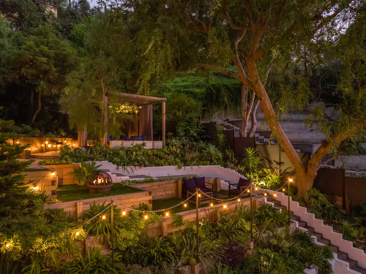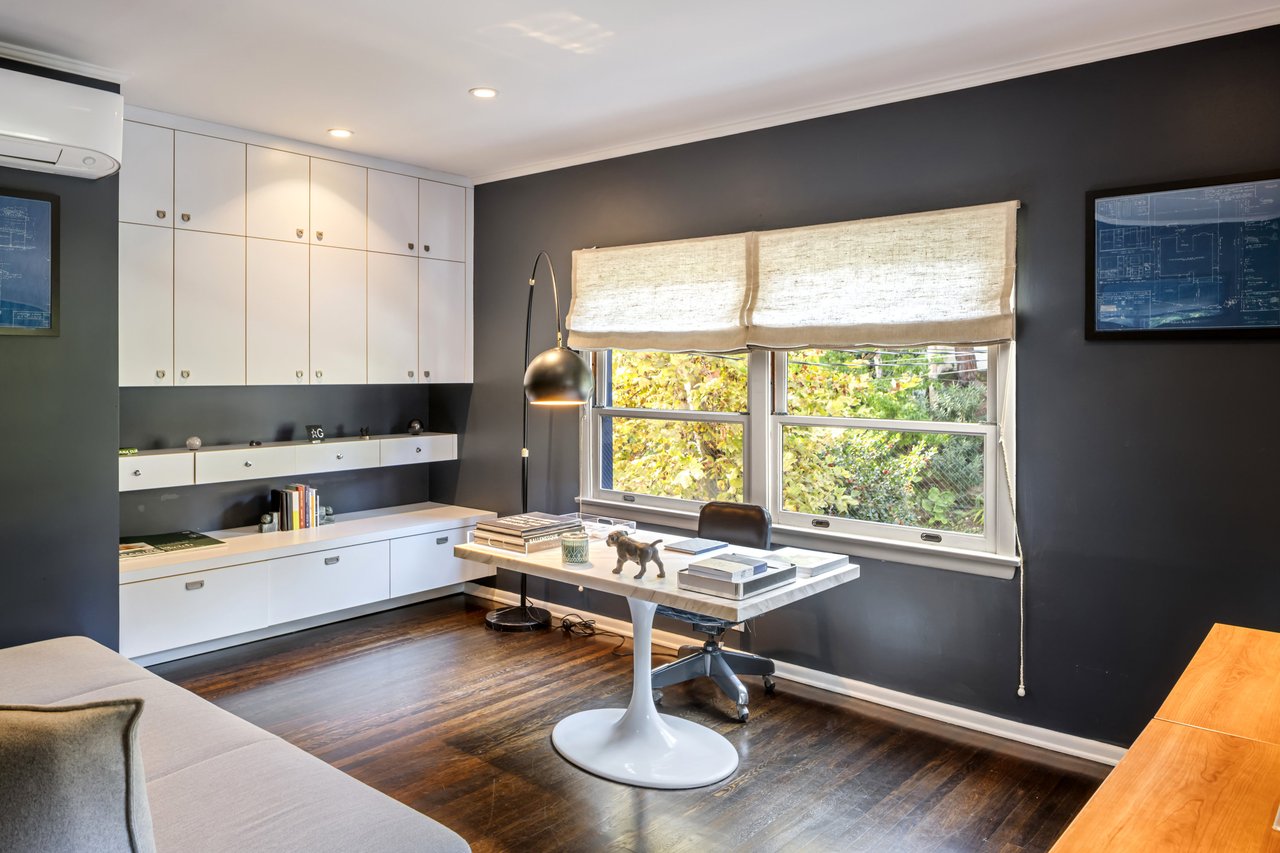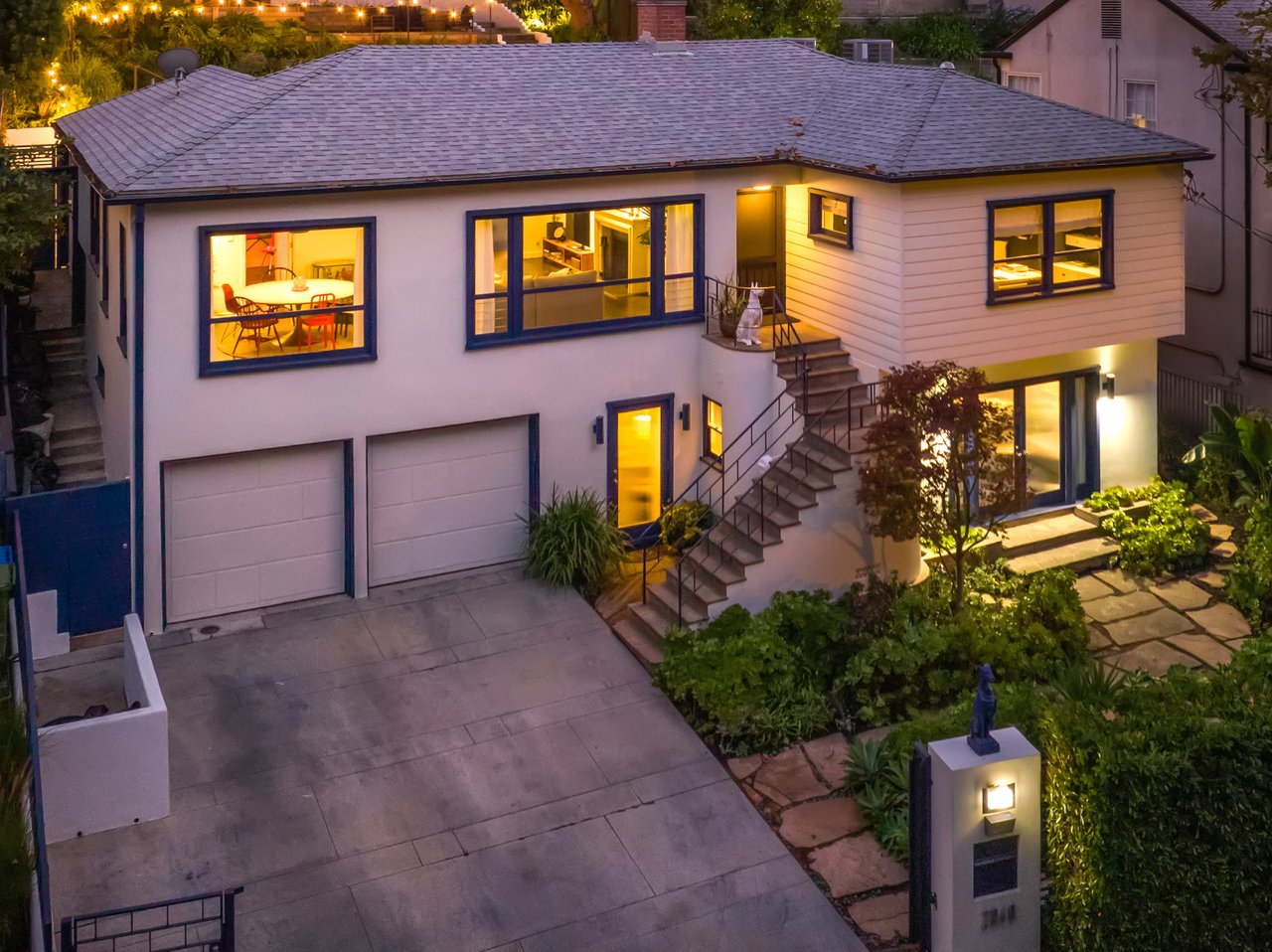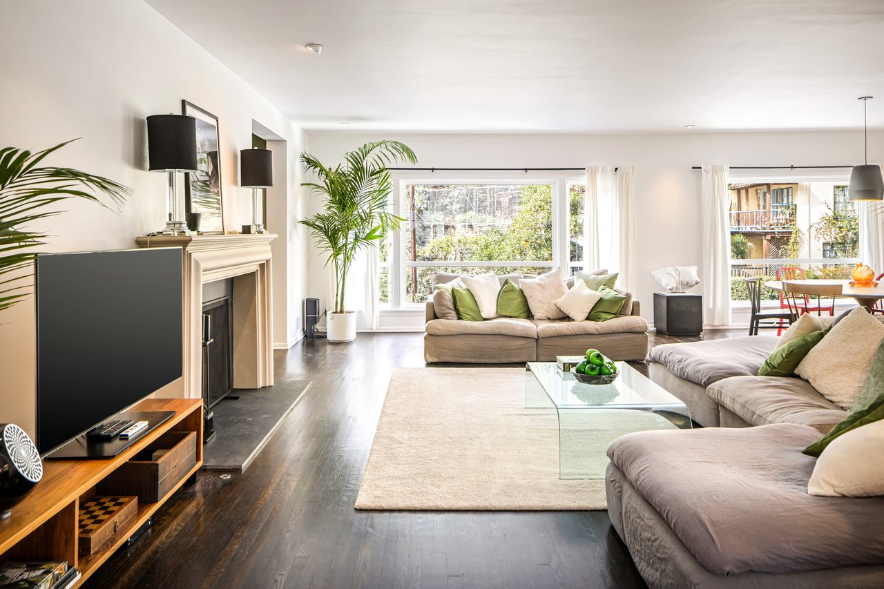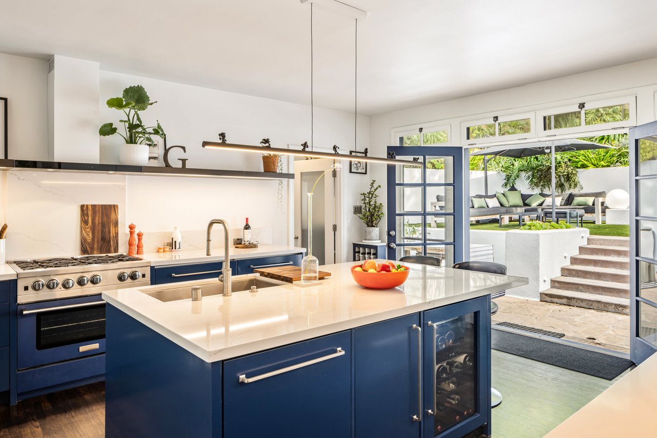 This gated Traditional home with mid-century modern influences sits on a large, wooded lot in upper Beachwood Canyon. Formerly celebrity-owned and tucked back from the street, this home's expansive rear yard is an outdoor sanctuary bringing the tranquility of nature to everyday living. Green canyon views can be seen from the oversized windows creating an airiness throughout the living space, anchored by a renovated kitchen which seamlessly joins both interior living and the outdoors. The kitchen is outfitted with built-in, luxury appliances, a large island, and plentiful countertop prep space. Whether you prefer entertaining or quiet fireside moments, this home offers the space for your household to sprawl on the 4 bedroom, 3 bath main level inclusive of an oversized, primary suite with custom Walnut built-in's and dedicated laundry/utility room. Rear French doors open to your own secluded park-like garden designed for entertaining. Winding paths of the curated grounds showcase its succulent gardens, professionally landscaped terraces, several lounging areas, banana and Meyer lemon trees, and private hilltop pergola illuminated by a masterfully designed light installation. Out of town guests can enjoy the privacy of a private guest suite on the lower level with its own kitchenette, bathroom, bedroom/office and private garden. The two-car garage features built-in cabinets & utility sink. Close to hiking trails, Beachwood market, city night life, and major studios. Experience the magic of this private sanctuary in iconic Beachwood Canyon.