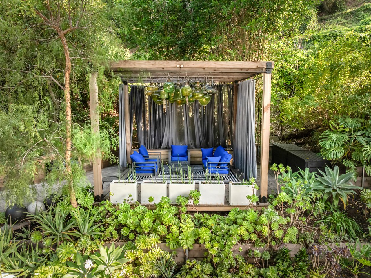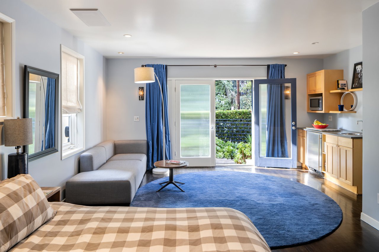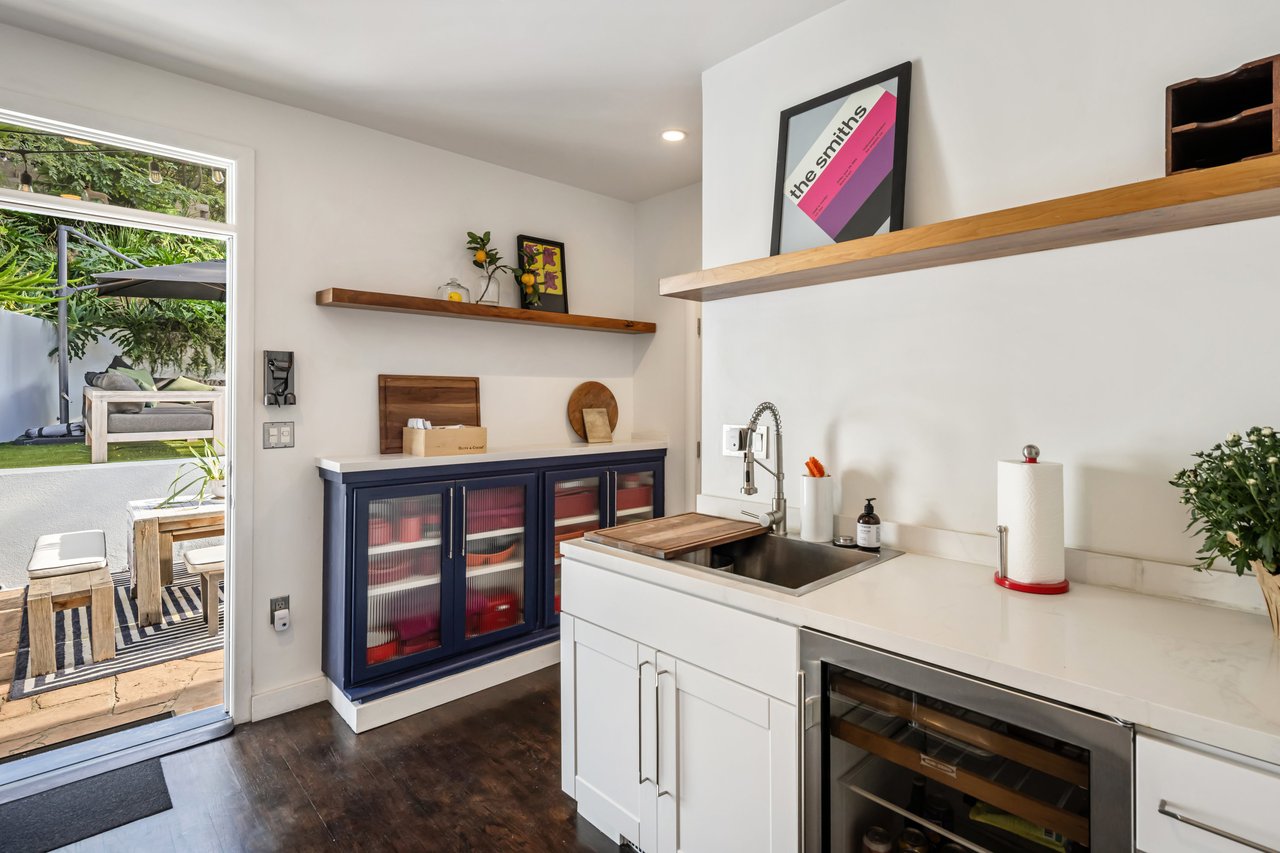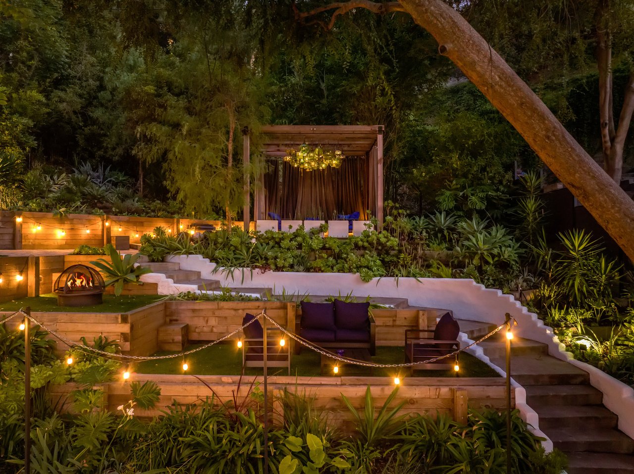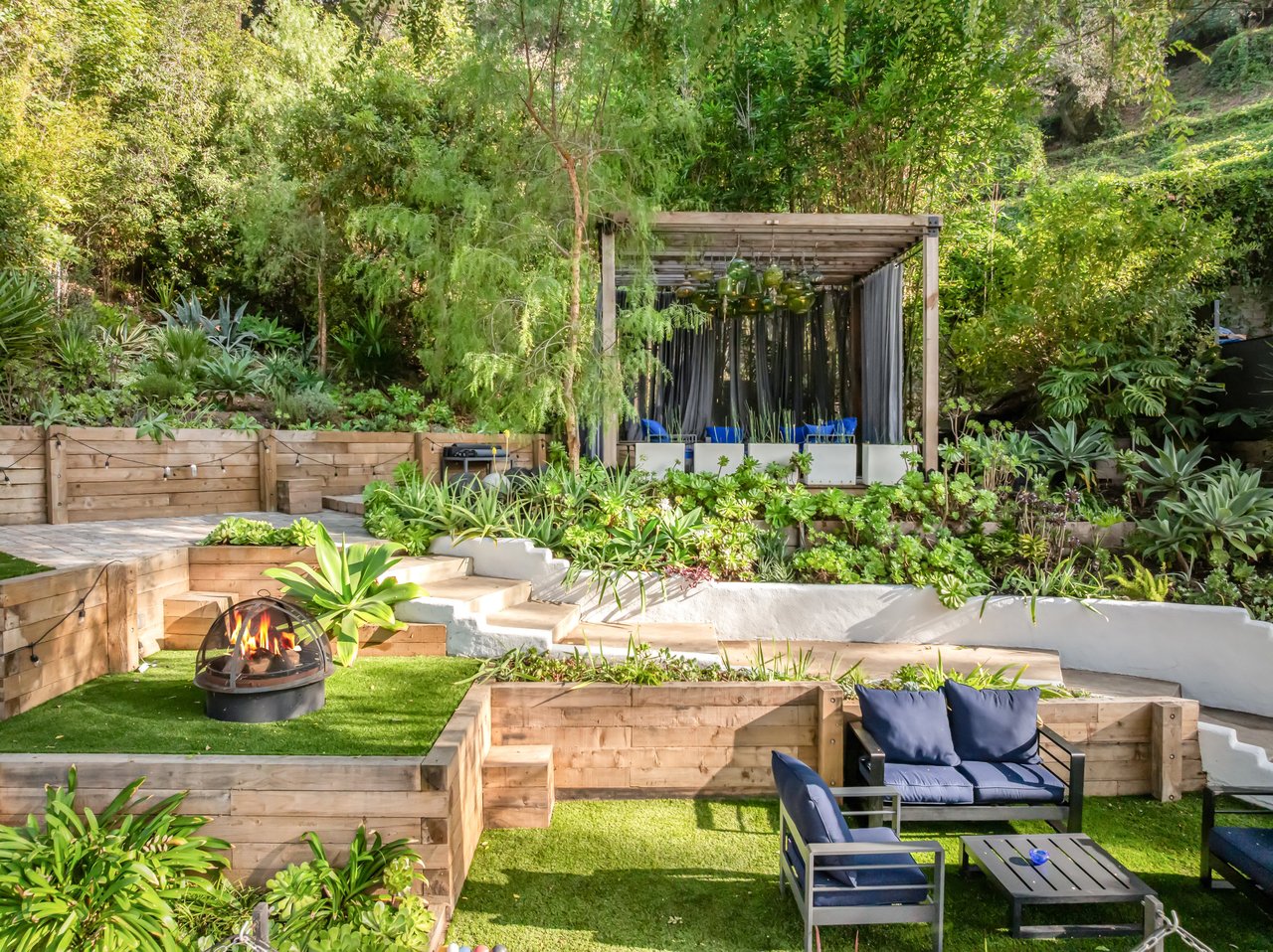 This gated Traditional home with mid-century modern influences sits on a large, wooded lot in upper Beachwood Canyon. Formerly celebrity-owned and tucked back from the street, this home's expansive rear yard is an outdoor sanctuary bringing the tranquility of nature to everyday living. Green canyon views can be seen from the oversized windows creating an airiness throughout the living space, anchored by a renovated kitchen which seamlessly joins both interior living and the outdoors. The kitchen is outfitted with built-in, luxury appliances, a large island, and plentiful countertop prep space. Whether you prefer entertaining or quiet fireside moments, this home offers the space for your household to sprawl on the 4 bedroom, 3 bath main level inclusive of an oversized, primary suite with custom Walnut built-in's and dedicated laundry/utility room. Rear French doors open to your own secluded park-like garden designed for entertaining. Winding paths of the curated grounds showcase its succulent gardens, professionally landscaped terraces, several lounging areas, banana and Meyer lemon trees, and private hilltop pergola illuminated by a masterfully designed light installation. Out of town guests can enjoy the privacy of a private guest suite on the lower level with its own kitchenette, bathroom, bedroom/office and private garden. The two-car garage features built-in cabinets & utility sink. Close to hiking trails, Beachwood market, city night life, and major studios. Experience the magic of this private sanctuary in iconic Beachwood Canyon.