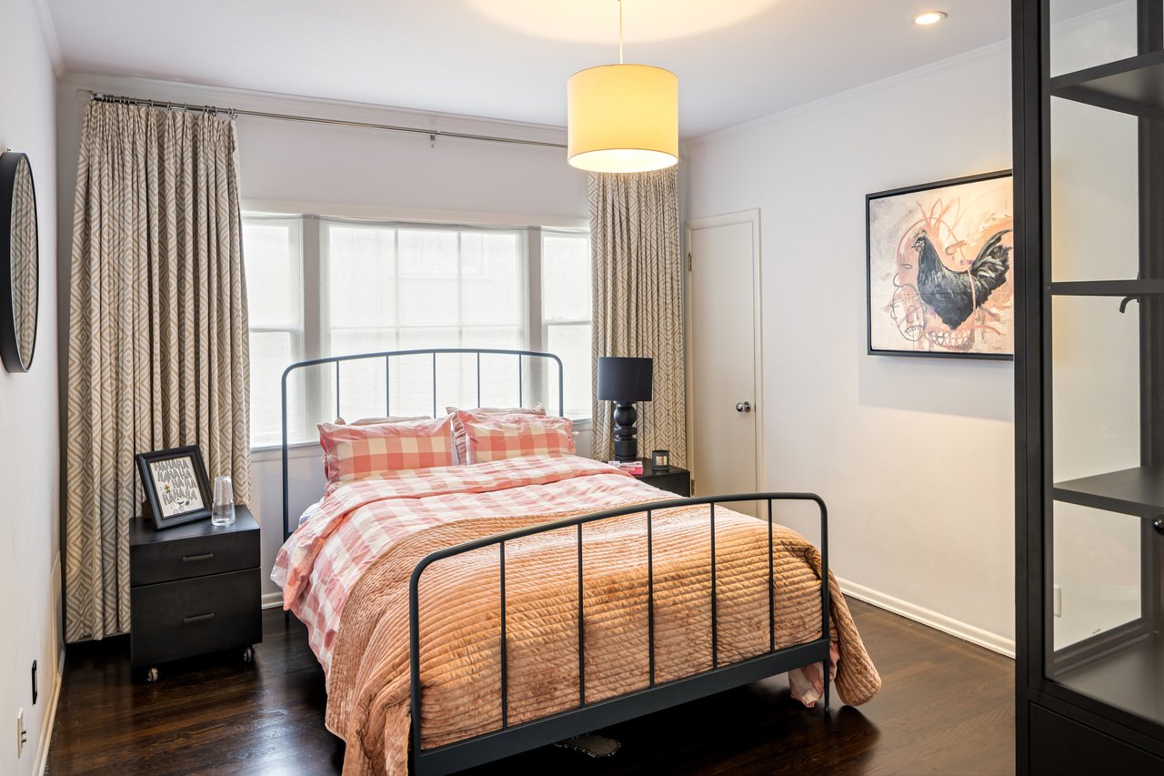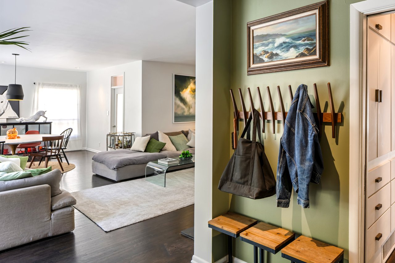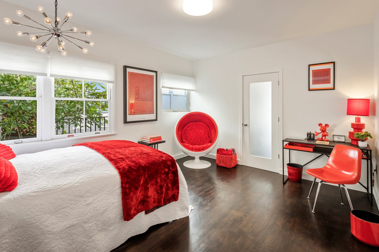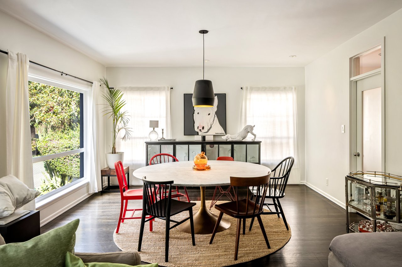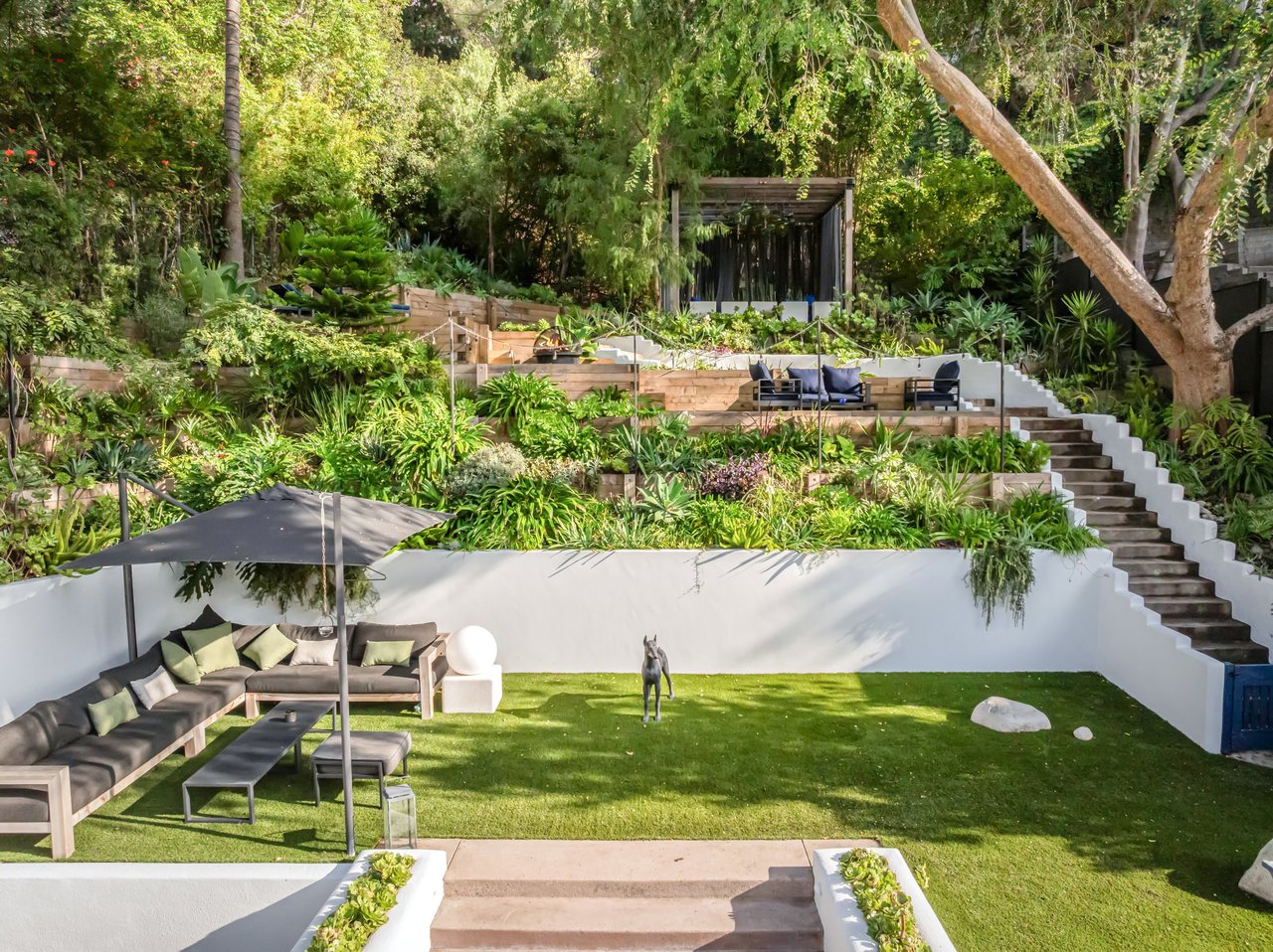 This gated Traditional home with mid-century modern influences sits on a large, wooded lot in upper Beachwood Canyon. Formerly celebrity-owned and tucked back from the street, this home's expansive rear yard is an outdoor sanctuary bringing the tranquility of nature to everyday living. Green canyon views can be seen from the oversized windows creating an airiness throughout the living space, anchored by a renovated kitchen which seamlessly joins both interior living and the outdoors. The kitchen is outfitted with built-in, luxury appliances, a large island, and plentiful countertop prep space. Whether you prefer entertaining or quiet fireside moments, this home offers the space for your household to sprawl on the 4 bedroom, 3 bath main level inclusive of an oversized, primary suite with custom Walnut built-in's and dedicated laundry/utility room. Rear French doors open to your own secluded park-like garden designed for entertaining. Winding paths of the curated grounds showcase its succulent gardens, professionally landscaped terraces, several lounging areas, banana and Meyer lemon trees, and private hilltop pergola illuminated by a masterfully designed light installation. Out of town guests can enjoy the privacy of a private guest suite on the lower level with its own kitchenette, bathroom, bedroom/office and private garden. The two-car garage features built-in cabinets & utility sink. Close to hiking trails, Beachwood market, city night life, and major studios. Experience the magic of this private sanctuary in iconic Beachwood Canyon.